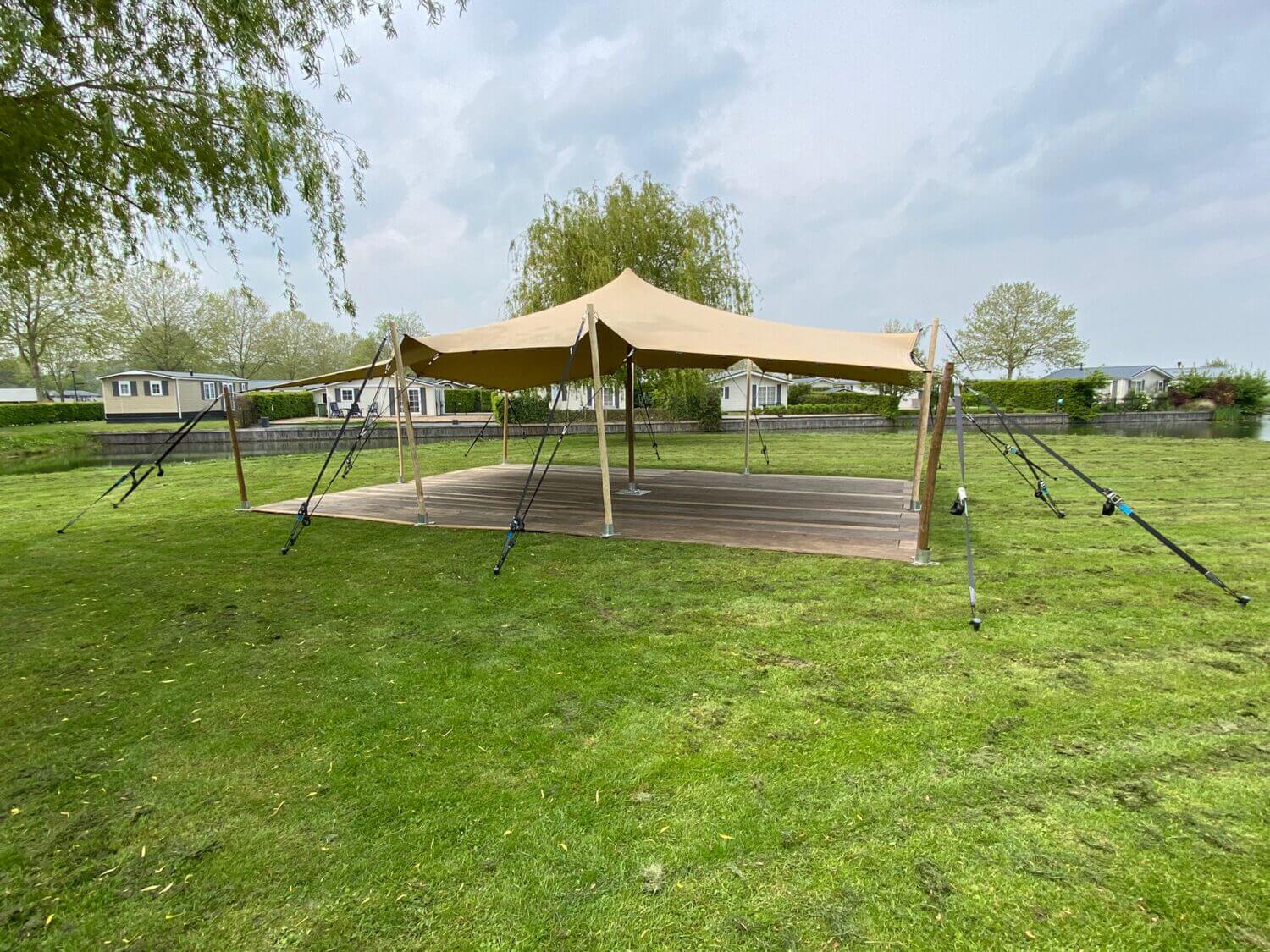 ![]() | Stretchtent 6 x 10 meter van stevig zandkleurig doek, kastanje houten palen. Inclusief op en afbouwen | € 600 p/d € 900 wknd | Mail voor meer informatie |